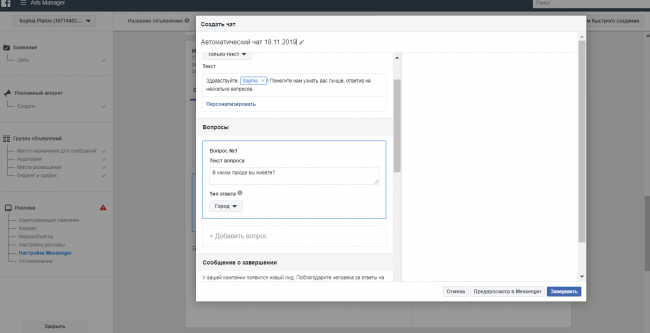Для рекламы, ведущей в Messenger, можно настроить шаблоны взаимодействия с пользователями на уровне создания объявлений.