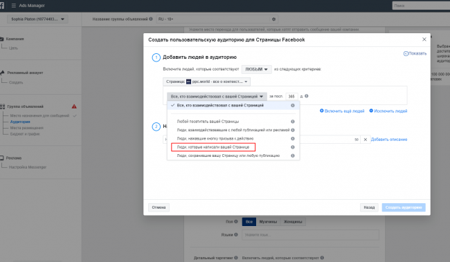 Выберите страницу, от лица которой будут приходить сообщения, затем выполните стандартные настройки кампании. При настройке таргетинга используйте индивидуализированную аудиторию, состоящую из пользователей, которые переписывались со страницей бизнеса.