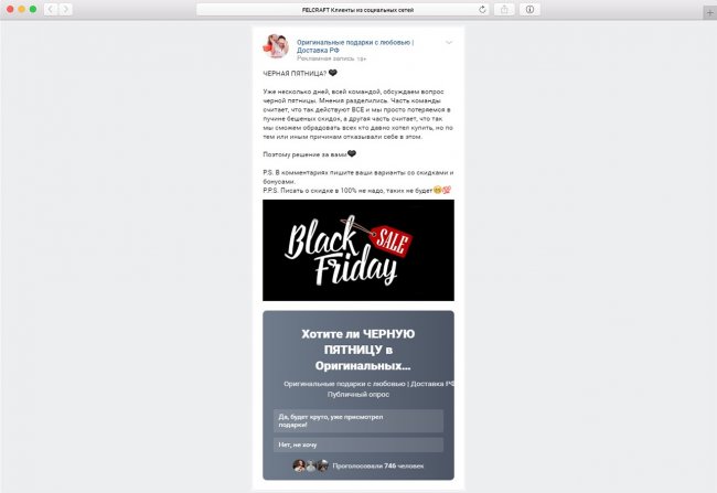 На стене сообщества 14 ноября разместили опрос о том, нужно ли проводить Черную пятницу — возможность принять решение предоставили подписчикам. Мы попросили участников оставить свои варианты со скидками и предложениями в комментариях к посту. Сам пост с опросом был разослан по базе. Благодаря рассылке в этом опросе приняли участие 746 человек, 95 предложений оставили в комментариях.