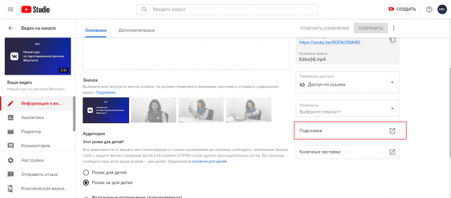 Подсказки можно настроить в Творческой студии YouTube. Выберите нужное видео и нажмите на кнопку «Подсказки».