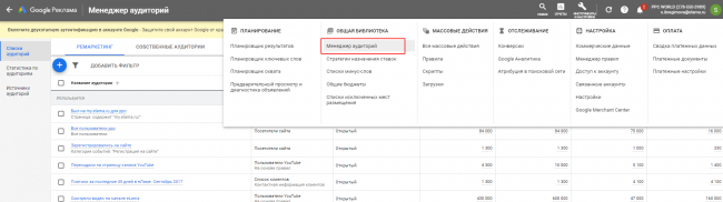 Создайте аудиторию ремаркетинга, перейдя в «Инструменты» — «Общая библиотека» — «Менеджер аудиторий».
