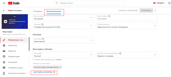 Субтитры добавляются на странице редактирования видео в Творческой студии YouTube. Выберите нужное видео, перейдите на страницу редактирования, затем кликните на раздел «Дополнительные» — «Загрузить субтитры».