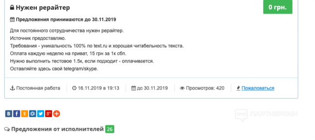 15 грн это около 40 рублей, можно искать еще дешевле. На скрине видно, что оставлено 26 предложений, это очень много. Таким образом, контент обойдется в 6*40=240 рублей в день или 7500 в месяц. Так что стоит подумать над тем, чтобы писать самому.