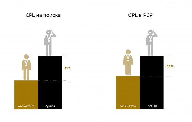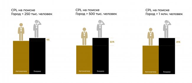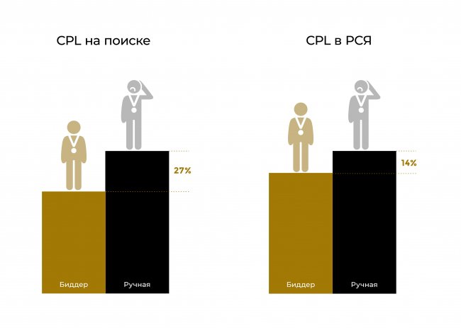 По результатам ряда A/Б-тестов лиды у биддера на поиске оказались на 30% дешевле, в РСЯ — на 15%. При этом количество лидов также увеличилось на 15–40%. (Приводим усредненное значение CPL по нескольким экспериментам).