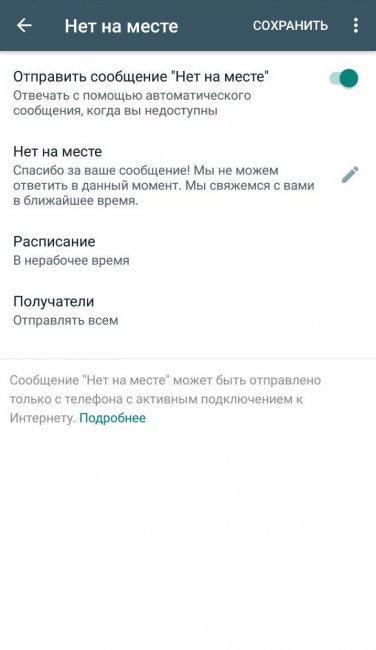 Нет на месте. Настраивают, чтобы пользователи получали автоответы, пока вы недоступны, например, когда магазин закрыт. Сообщения можно планировать на время.