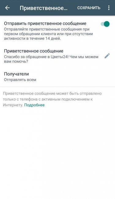 Настраиваем автоматические сообщения. Снова открываем меню (три точки) в правом верхнем углу. В выпадающем списке выбираем «Настройки» — «Бизнес-настройки». Внизу доступен раздел «Управление сообщениями», где можно создать несколько типов сообщений: