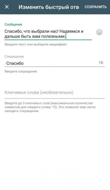 Быстрые ответы. Владелец бизнеса может сделать общение с пользователями более быстрым и эффективным: подготовить шаблоны сообщений и привязать их к ключевым словам.