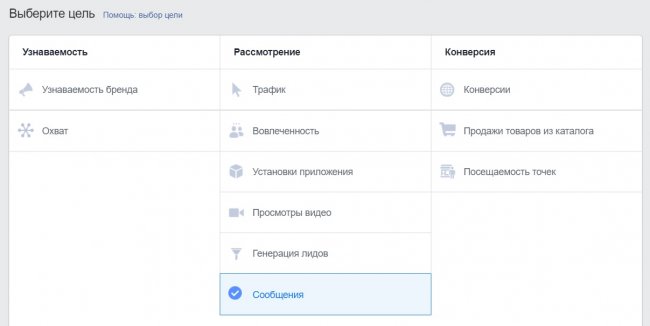 Чтобы создать объявления с переходом в кампанию WhatsApp, выбираем цель «Сообщения».