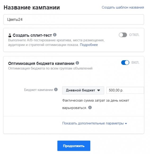 Задаем название и бюджет кампании. Также тут можно выбрать А/Б-тестирование, если вы хотите определить более эффективный креатив из нескольких. Больше ничего менять не нужно.