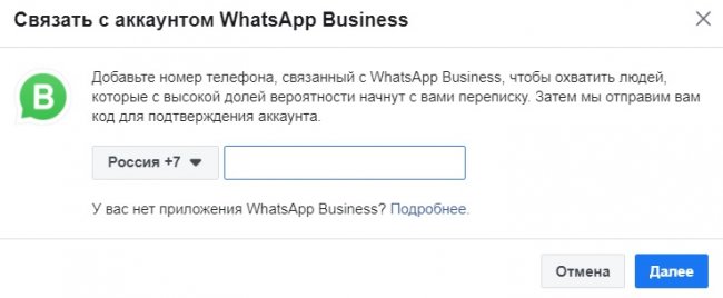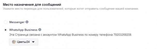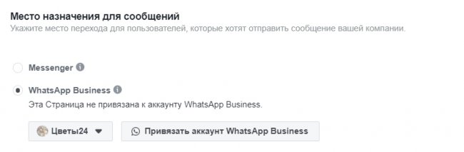 В пункте «Место назначения для сообщений» выбираем WhatsApp Business и далее страницу кампании. Если ранее вы не привязали ее к WhatsApp Business, то можете сделать это сейчас — нажать на соответствующую кнопку ниже и ввести номер телефона, привязанный к бизнес-профилю.