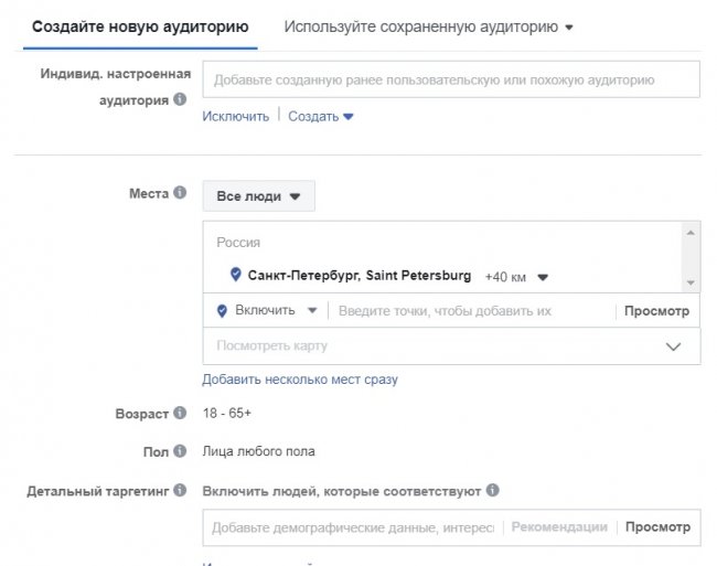 Другой вариант — выбрать аудиторию вручную, для этого задаем: места (местные жители, путешественники, недавние посетители или все люди), возраст, пол и, если необходимо, языки и связи с вашей страницей, чтобы отобрать людей, каким-то образом связанных с ней.