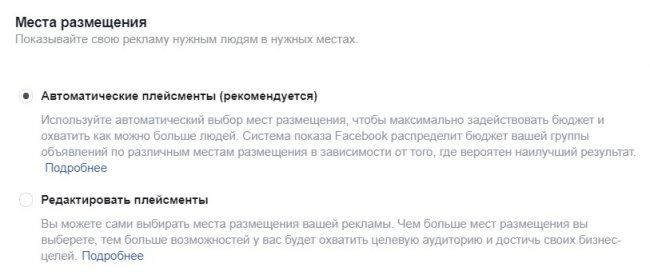 Задаем места размещения. Для этого доступны автоматические плейсменты, которые рекомендуются большему числу рекламодателей и позволяют охватить больше пользователей во всех приложениях и сервисах Facebook (ленты, истории, In-Stream, сообщения, в статьях, приложения и сайты). Также рекламодатель может редактировать плейсменты, исключить неэффективные.