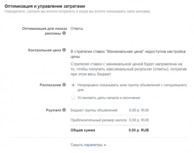 Задаем расписание показа и дополнительные параметры — лимит расходов для группы объявлений и вариант, при котором вы будете платить за рекламу. Для цели «Сообщения» доступен только «Показ».