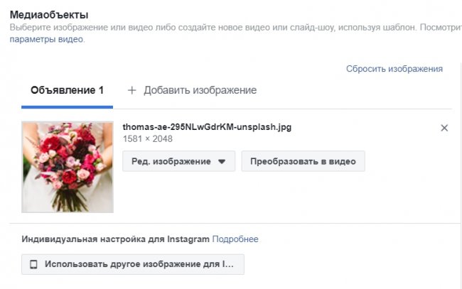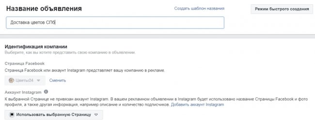 Даем название объявлению, а также выбираем страницу Facebook или аккаунт Instagram, которые будут представлять бренд в рекламе. Чтобы использовать аккаунт Instagram, потребуется сначала привязать к нему страницу.