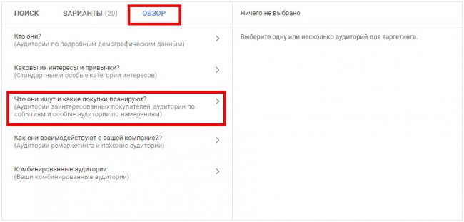 Затем в выпавшем окне переходим на вкладку «Обзор» и в раздел «Что они ищут и какие покупки планируют»: