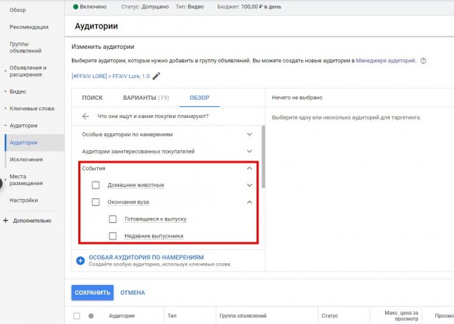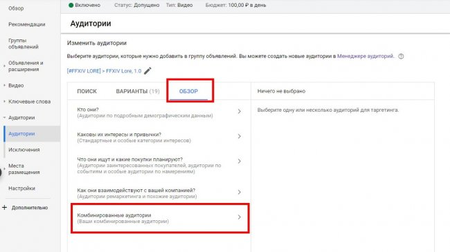 Чтобы установить таргетинг в созданной видео- или КМС-кампании, нам необходимо зайти в раздел «Аудитории»: