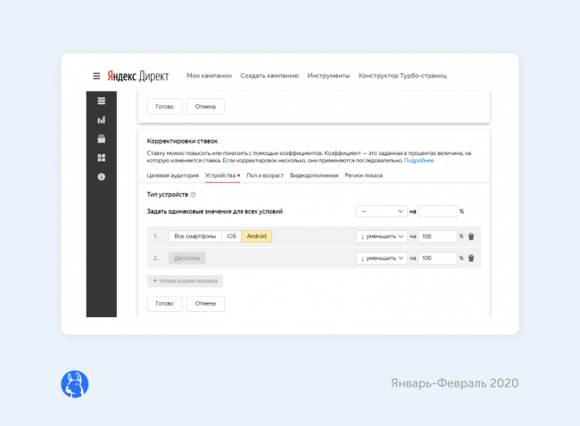 предоставила возможность рекламодателям отключать рекламу на десктопах и разделять аудиторию со смартфонами на iOS и Android. Диапазон корректировки для десктопов составляет от ?100 до +300%, для мобильных операционных систем — от ?100 до +1200%.