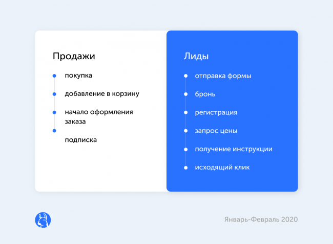 появились более детальные варианты действий-конверсий на сайте. Новые цели появились в двух категориях: продажи и лиды. Среди них — покупка, подписка, регистрация, отправка формы, бронь и другие.