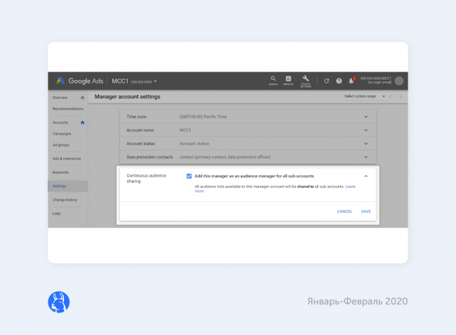 В справке Google сказано, что первым шагом необходимо запустить опцию в настройках управляющего аккаунта. После чего появится возможность открыть доступ к аудиториям в каждом клиентском аккаунте в разделе Менеджер аудиторий.