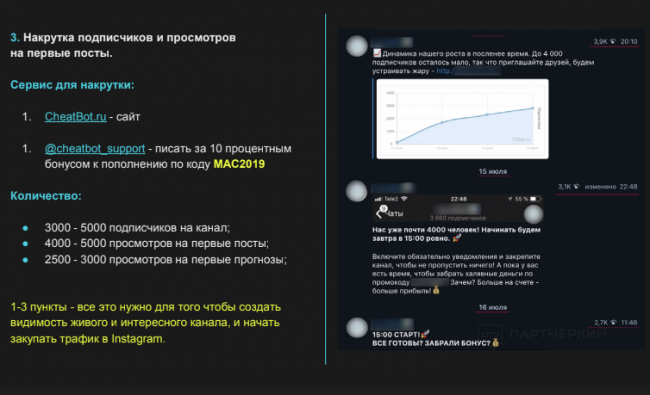 Параллельно на бесплатный канал закупается трафик из Instagram, постепенно канал заполняется потенциальными игроками. К постам с прогнозами прикрепляются кнопки, которые уже ведут первых пользователей на лендинг. В конце каждого дня необходимо публиковать сводку по прогнозам, доходы и отзывы.