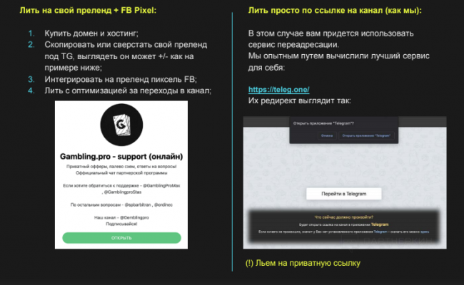 Раньше самым популярным способом был слив на преленд+FB пиксель. У этого способа очень много заморочек. Покупка домена и хостинга, верстка лендинга, интеграция пикселя и оптимизация переходов. Можно сделать проще сливать через сервисы переадресации. Подобных много, но использовать можно только два: