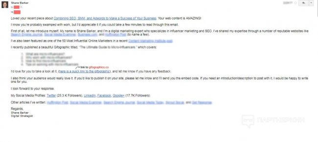 С помощью BuzzSumo исследовали актуальные темы и создали на их основе инфографику. Затем с помощью GroupHigh отыскали авторитетные сайты и стали договариваться о сотрудничестве. В сообщении будущим партнерам писали по схеме: