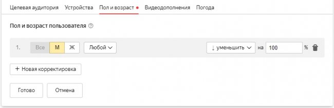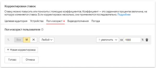 Шаг 2. Если ставка 25 рублей, то при корректировке в +1000% для мужчин максимальная ставка составит 250 рублей.