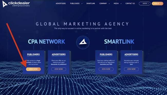 При регистрации смотрим на раздел CPA Network, выбираем “Publishers” и нажимаем кнопку “Join Now”