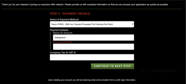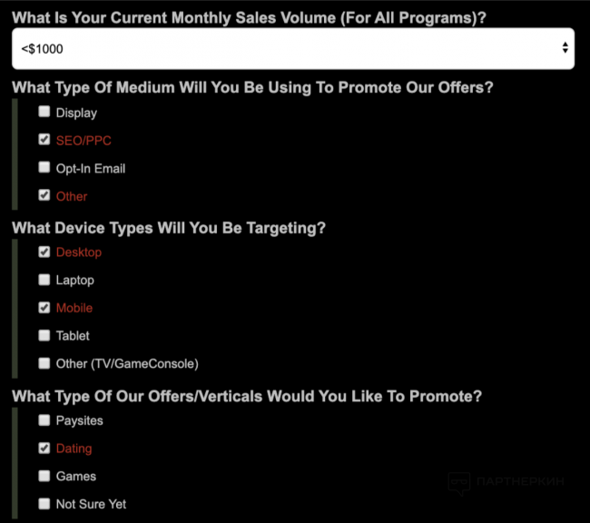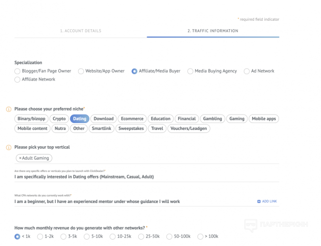 - Please pick your top vertical — Я выбрал Adult Gaming, по ней я читал больше всего информации, вы можете выбрать любую вертикаль, относящуюся к Dating конечно же