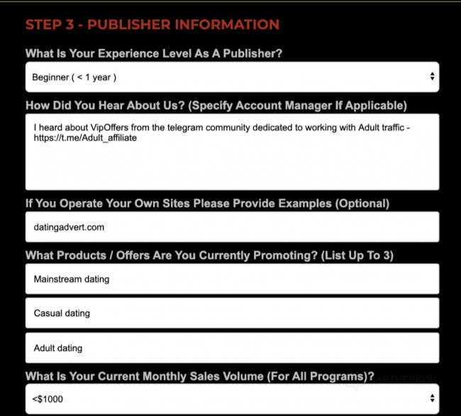 2. How Did You Hear About Us? (Specify Account Manager If Applicable) — I heard about VipOffers from the telegram community dedicated to working with Adult traffic - https://t.me/Adult_affiliate