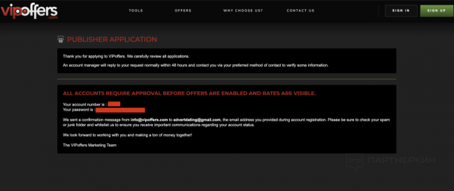 После отправки формы, видим вот такое сообщение с вашим логином и паролем: Thank you for applying to VIPoffers. We carefully review all applications.