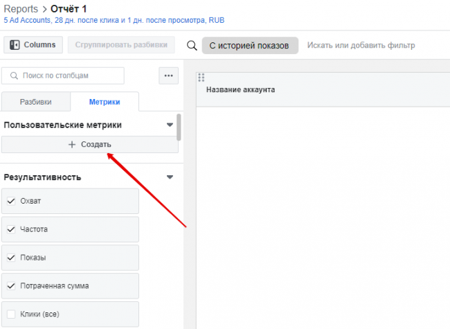 На вкладке «Метрики» можно создать специальные пользовательские метрики, сохранить их и использовать в будущих отчетах. На вкладке «Разбивки» отметьте название аккаунта, чтобы понимать, к какому аккаунту относятся рекламные кампании.