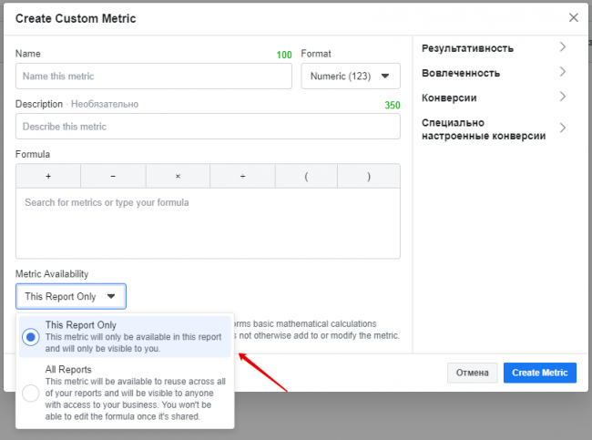 Выбираем, хотим сделать эту метрику доступной для всех последующих отчетов и для всех, кто работает с ними, либо только для конкретного отчета (в этом случае метрика будет доступна только вам). Мы выбрали «использовать метрику только для этого отчета» и «только для меня».
