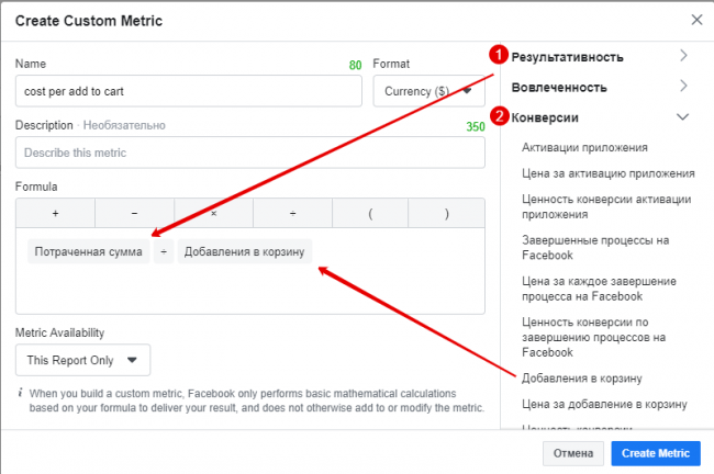 Пользовательскую метрику нужно назвать и выбирать ее формат (числа, проценты, валюта). При желании можно описывать, что подразумевает эта метрика. Например, мы хотим узнать стоимость события Add to Cart. Мы можем создать эту метрику сами.