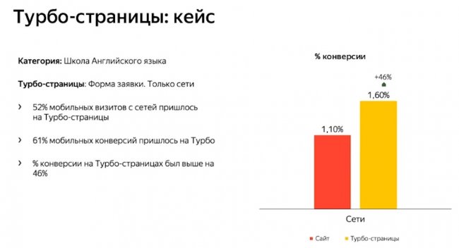 Школа английского языка тестировала турбо-страницы в сравнении с мобильной версией сайта. В итоге турбо-страницы превзошли сайт.