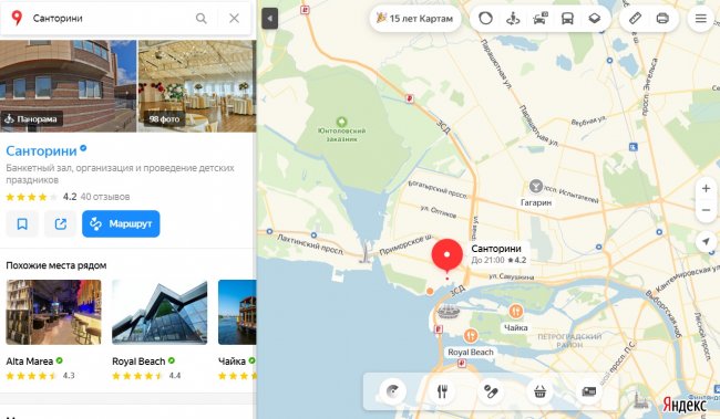 Если пользователь будет искать компанию в Картах по названию, виду деятельности и местоположению, то получит список карточек организаций из Справочника.