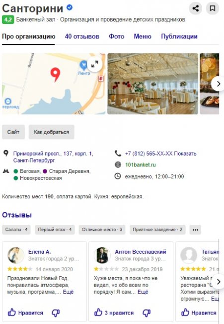 Профиль компании в Яндексе. Ниже есть публикации о компании, меню и похожие места