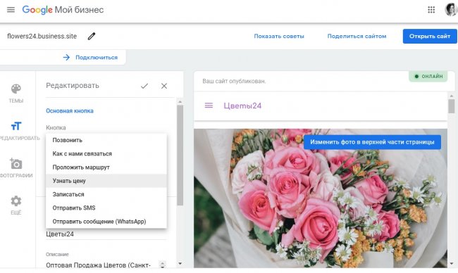 Конструктор сайта в Google Мой бизнес: можно установить тему сайта, редактировать кнопку и описание на странице, добавить фотографии товаров или услуг