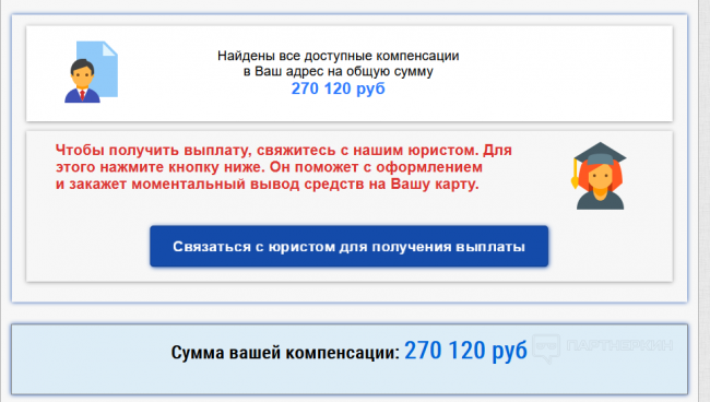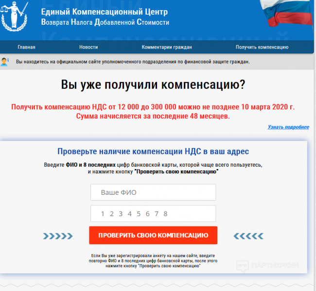 В оригинале там в самом начале страницы стоит герб, но я этого не захватил, думаю мало ли, кто читает этот пост. Смотрим, они пишут про какую то комиссию, и тут первая мысль о том что нужно будет что то заплатить в обмен на эту якобы денежную копенсацию. Прокладка стоит не на домене, на онлайн-конструкторе, но не совсем, думаю вы догадались.