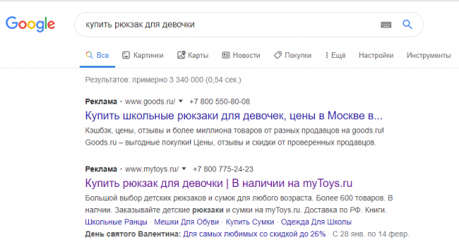 Рассмотрим пример. В начале января я решила посмотреть, сколько стоит рюкзак для девочки, ввела поисковый запрос и кликнула по объявлению:
