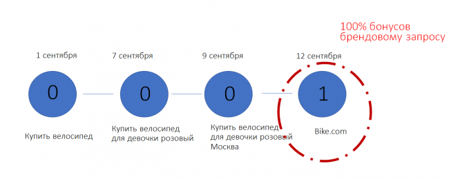 - Ну и наконец, 12 сентября он, побывав уже три раза на вашем сайте, вводит брендовый запрос bike.com и совершает покупку на вашем сайте.