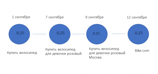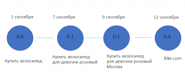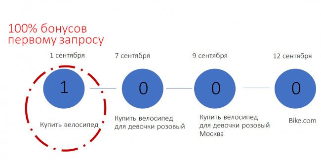 В случае с велосипедом для дочери 100% баллов будет присвоено кампании с общими запросами. Что тоже не совсем справедливо, на мой взгляд, ведь в цепочке участвовали еще несколько рекламных кампаний.