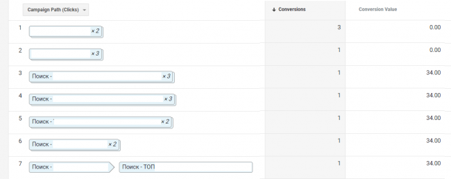Второй инструмент — это основные последовательности до конверсии. Здесь вы можете посмотреть, с каким кампаниями и как взаимодействуют пользователи до того, как совершат конверсию.
