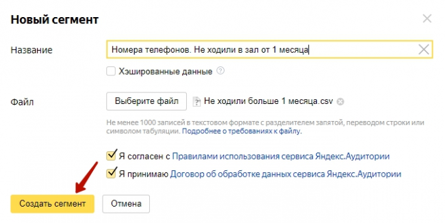 В открывшемся окне напишите название сегмента. Если все поля строк в файле захешированы (подробнее об этом — в требованиях Яндекса), то поставьте галочку на «Хешированные данные» и загрузите CSV-файл.