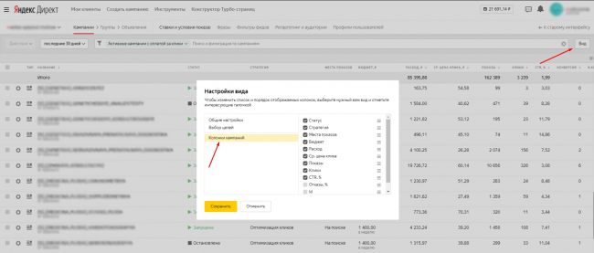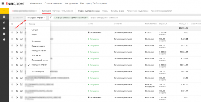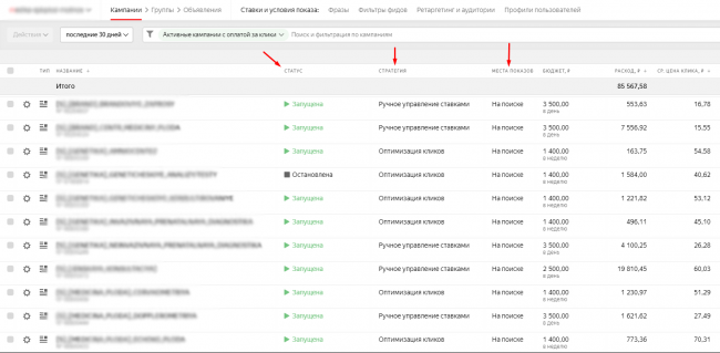 Нет возможности сортировать список кампаний по статусу, стратегии или местам показов. Но это было бы очень удобно. Конечно, можно поставить фильтр по этим параметрам, но видеть все кампании в отсортированном виде удобнее. Например, для сравнения показателей.