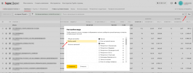 Выбор целей в настройках вида. Процент конверсии, количество целевых действий и CPA можно привязать только к нужным целям. Отображаться данные будут по каждой цели отдельно.