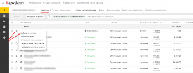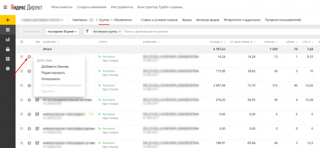 Нелегко разобраться, как добавить группу объявлений. В старом интерфейсе в кампании была заметная кнопка «Добавить группу объявлений». В новом же ее нет. Теперь, чтобы добавить группу объявлений, нужно нажать на шестеренку слева от кампании и выбрать пункт «Добавить группу».