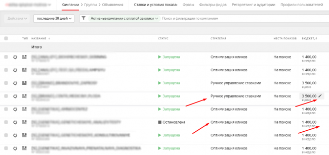 Редактировать бюджет кампании прямо из списка кампаний. Сейчас для этого нужно переходить в настройки кампании. И так — для всех, кроме кампаний со стратегией «Ручное управление ставками». Я очень ждал эту опцию в новом интерфейсе, но увы.