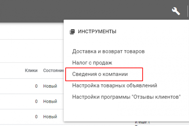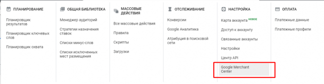 Merchant Center — это отдельная платформа для работы с товарами. Зайти в нее можно через панель «Инструменты и настройки» в правом верхнем углу аккаунта Google Ads.