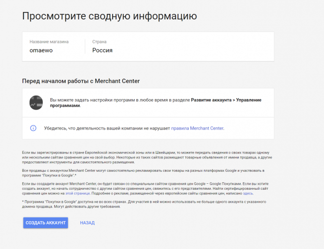 Аккаунт в Merchant Center